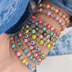 ジルコンエナメルイービルアイズビーズリンクチェーン、調節可能なゴールドチェーンブレスレットジュエリー、レインボーエナメルラウンドアイズチャームリンクチェーン