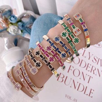 กำไลข้อมือชุบทอง18K,กำไลข้อมือมรกตสีรุ้งทรงเหลี่ยมเพชรสวิสสุดหรูกำไลข้อมืออินเทรนด์แบบเปิดปรับได้มีเสน่ห์เครื่องประดับขายส่ง